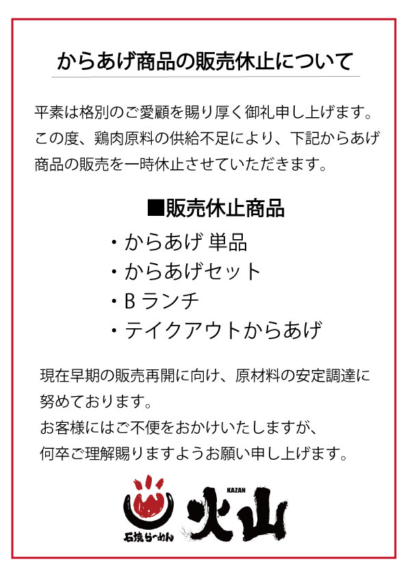 鶏肉原料の供給不足により、一部メニューの販売を当面の間休止いたします。詳細は